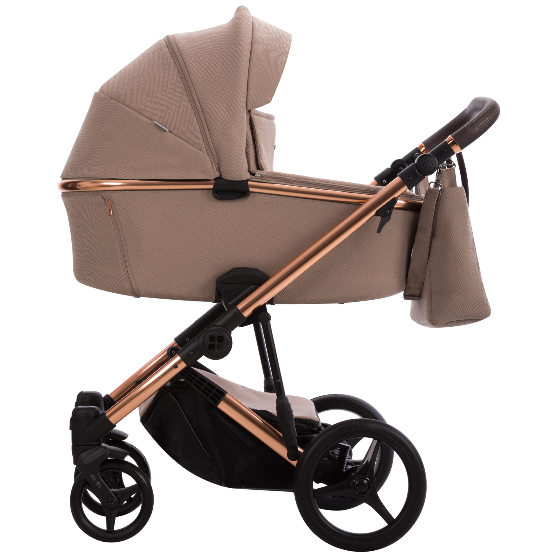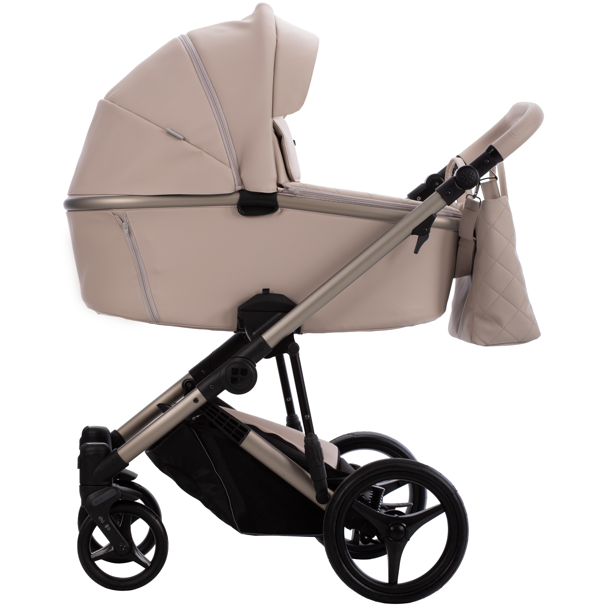 Ogromną zaletą wózka Loren Premium Class jest jego stelaż. Nie tylko wspaniale się prezentuje i mieni unikatową barwą, ale jest przy tym bardzo lekki i składa się do kompaktowych rozmiarów. Za doskonałe właściwości jezdne odpowiadają zarówno systemy SAS (amortyzacja) i DMS (ochrona przed blokowaniem się kół na nierównościach), jak i boczne dwustopniowe amortyzatory Soft/Hard, które można ułożyć w trybie miękkim lub twardym. Niepompowane koła zapewniają doskonałą sprężystość, a jednocześnie nie wymagają dbania o ciśnienie w oponach. Wszystko to sprawia, że dzięki zaawansowanemu stelażowi, wózek jest zwrotny, komfortowy i praktyczny – i doskonale sprawdzi się w każdym terenie. W wózku zastosowano nowy system kół. Przednie – mini – zapewniają zwrotność. Tylne – dzięki dużemu rozmiarowi – doskonale amortyzują i zwiększają komfort podczas podróży. Stelaż jest wyposażony w koszyk zakupowy z wyjmowaną torbą, dostosowaną do koloru tapicerki wózka. To niezwykle wygodne zawsze wtedy, gdy chcesz zabrać więcej potrzebnych rzeczy na spacer z dzieckiem. Duża pojemność torby sprawia, że pomieścisz w niej także codzienne zakupy.DODATKOWE AKCESORIA